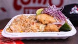Choose 2 options, chaufa, tallarines or papa a la huancaina. Choose 1 option: Tostones, maduros or yuca fries.